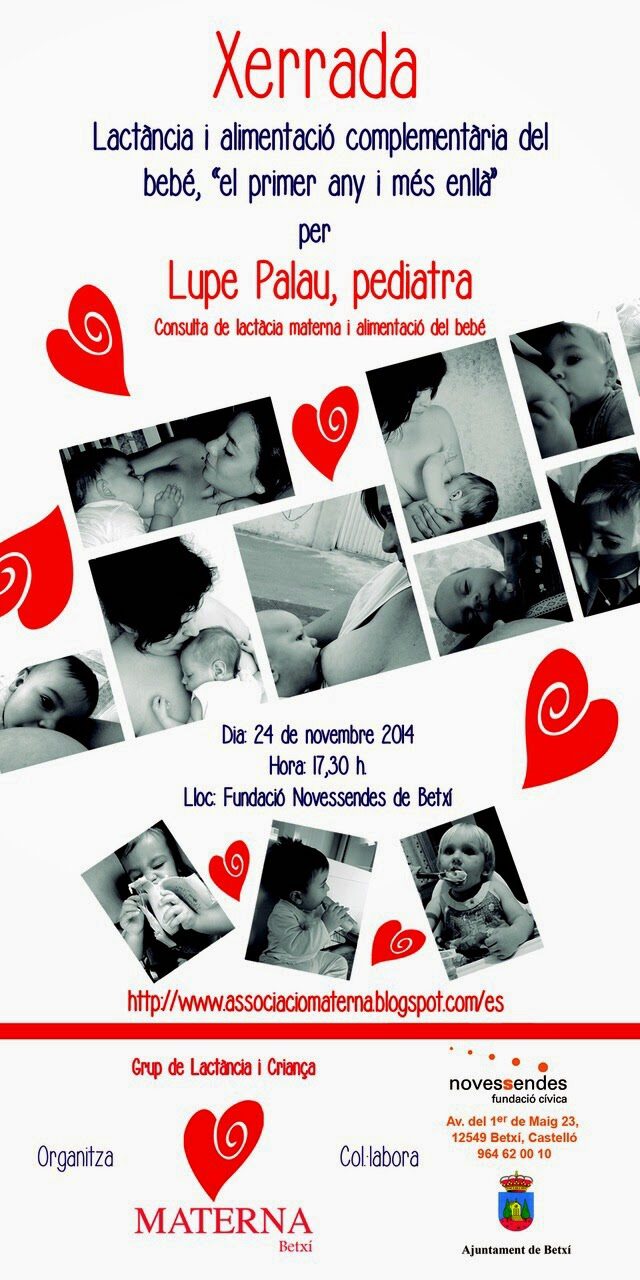 El grup de recolzament a la criança i la lactància materna de Betxí (MATERNA) ha organitzat la conferència ”Lactància i alimentació complementaria del bebé. El primer any i més enllà”, que serà impartida per la Pediatra, Dra. Lupe Palau, especialitzada en Lactància Materna, i membre de l’Associació MAMARE de Castelló.