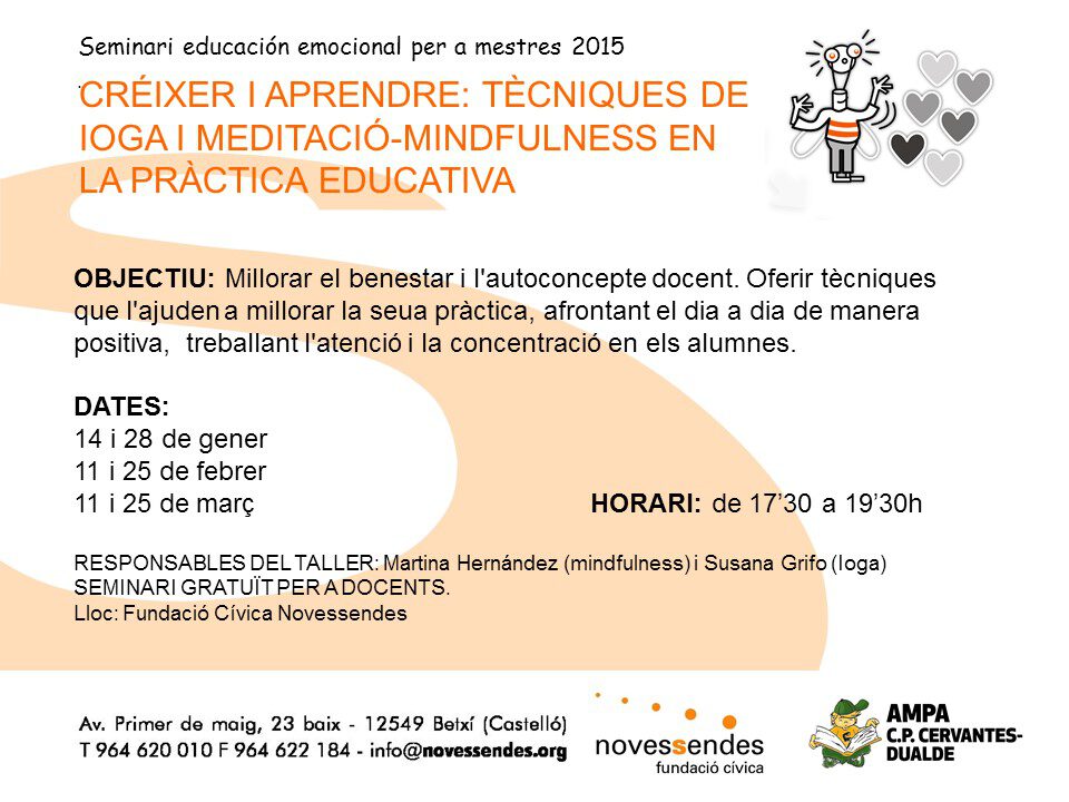 Desde la Fundació Novessendes concebidos la tarea del docente más allá de la preparación intelectual y el manejo de los contenidos. Por este hecho, desde nuestra área de educación en valores, siempre hemos apostado por apoyar a los docentes en esta tarea. Se pretende crear un espacio de formación y reflexión personal tanto fuera como dentro del aula, donde poder reconocer y conocer las emociones propias y así las de los niños y niñas a los que educamos cada día. El gran reto de este proyecto se basa en implicar a toda la comunidad educativa.