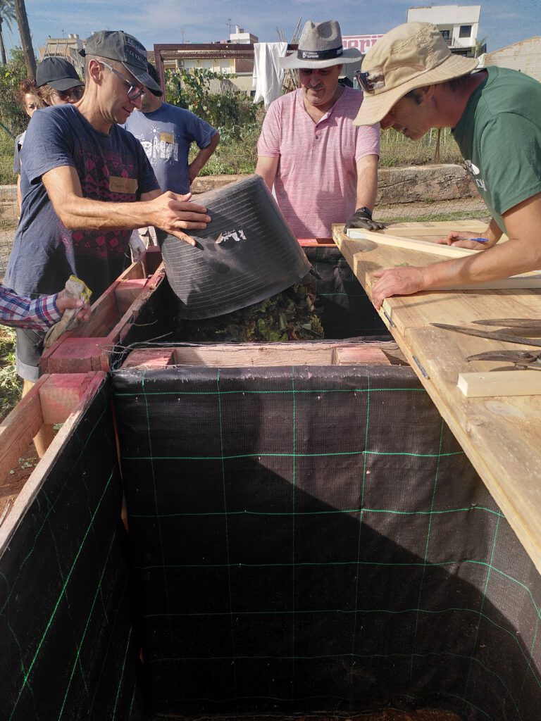 Per altra banda, per assolir una millor gestió de l’espai, mantenint l’aspecte i ordre general per continuar podent-lo aprofitar per a les activitats socioeducatives, s’ha optat (enfront de l’opció de piles) per la solució de blocs de composteres tancades realitzades principalment amb materials reciclats per un grup de persones en formació. D’aquesta manera es podrà produir el compost més prop de les zones de treball, facilitant la seua incorporació al sol, i les tasques de farcit i manteniment. Durant aquest procés s’ha avaluat positivament la incorporació de residus orgànics domèstics de les col·laboradores que consumeixen les caixetes, que a banda de tancar el cicle i ajudar a fomentar més i nous lligams socials amb l’espai, fomenten el seu reciclatge i la reducció dels residus sòlids urbans.